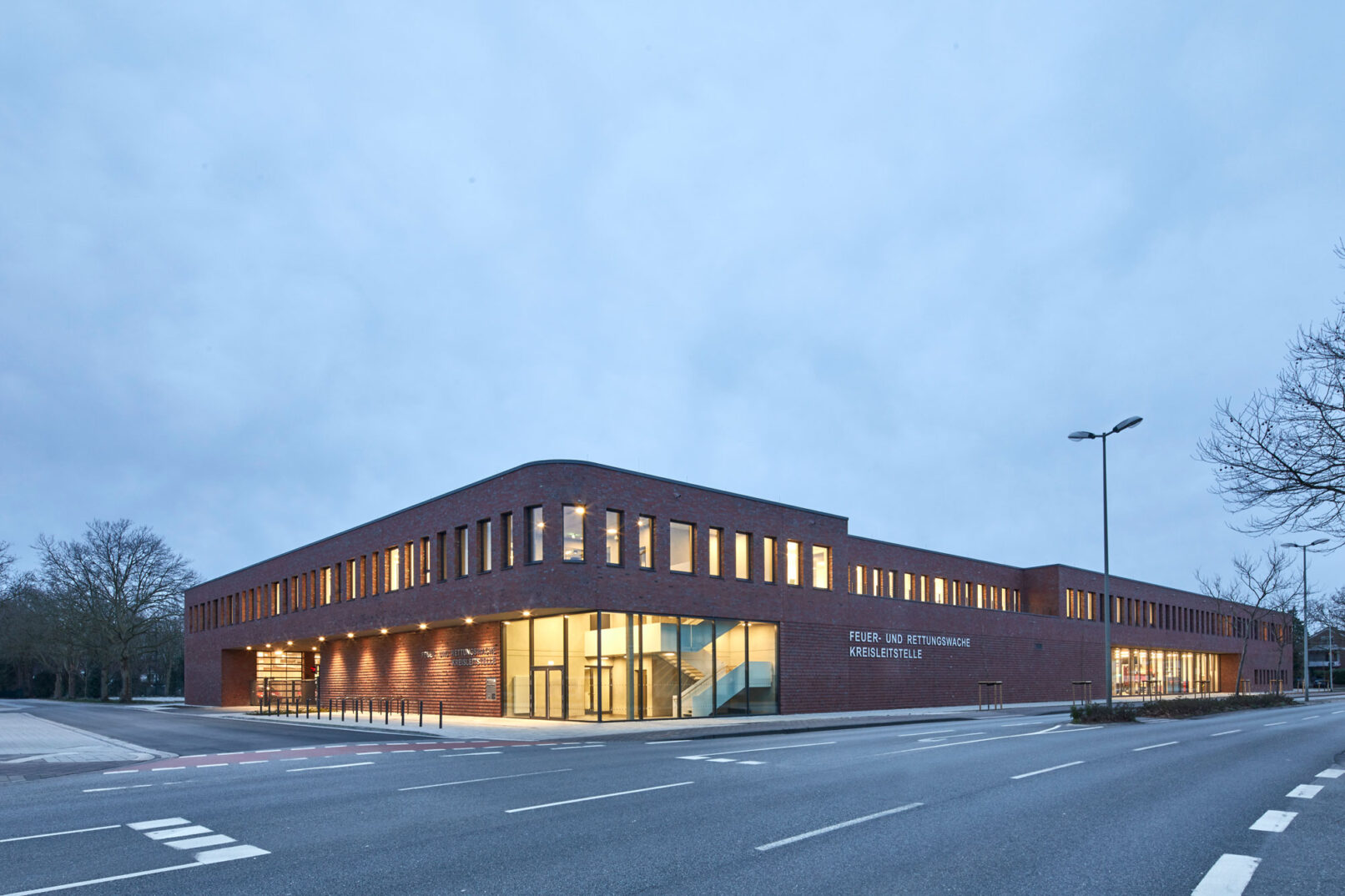 Der Neubau der Feuer- und Rettungswache mit integrierter Kreisleitstelle bildet als Eingang zum Zentrum der Stadt Gütersloh innerhalb der heterogen geprägten, kleinteiligen Umgebungsbebauung einen markanten, ruhigen neuen Stadtbaustein. Dabei ist das Gebäude als Hoftypologie um einen allseitig umschlossenen Betriebshof organisiert. Die Gebäudefluchten entwickeln sich konsequent aus den Raumbezügen der Umgebung; zur Friedrich-Ebert-Straße ist das Gebäude zweigeschossig, zum angrenzenden Festplatz eingeschossig ausgebildet. Das Gebäudevolumen ist durch wechselnde Einschnitte gegliedert, die in Maßstäblichkeit und Rhythmus mit der Umgebung kommunizieren und das Gebäude zur Stadt öffnen. Die Materialität des Fassadenklinkers unterstützt diesen Wechsel aus offenen und geschlossenen Flächen.