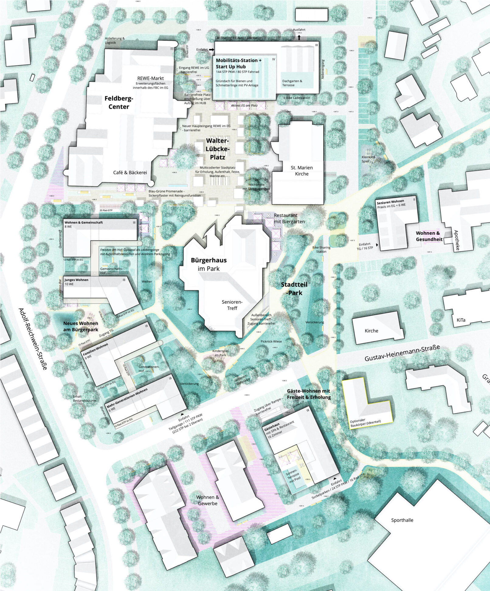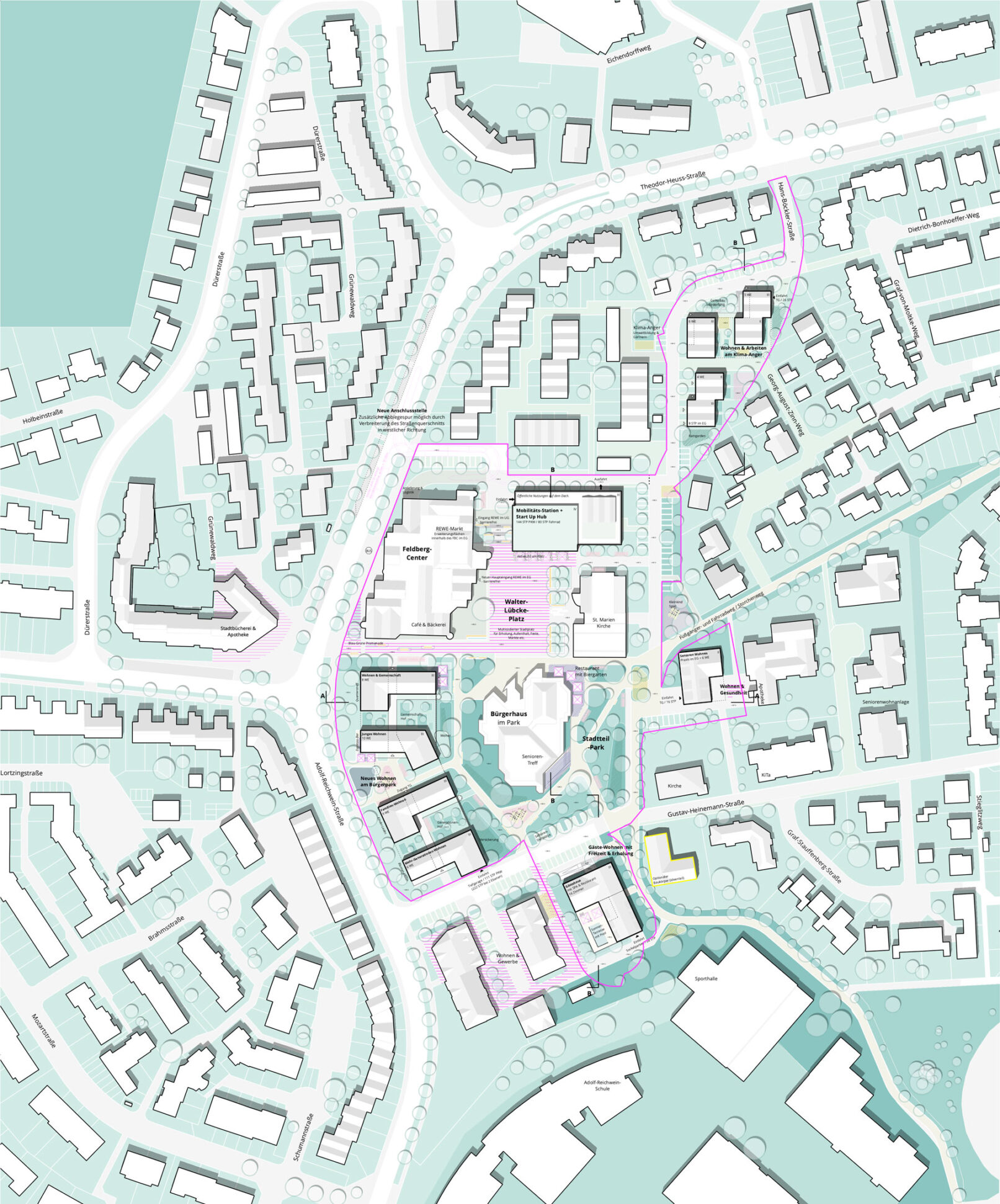 Der Bereich um Feldberg Center und Bürgerhaus bietet ein hohes Potential zur Nachverdichtung mit unterschiedlichen Wohnraumangeboten und Qualifizierung der derzeit durch ruhenden Verkehr geprägten Freiräume. Zur Entwicklung eines urbanen, gemischten Quartiers mit lebendigen öffentlichen Räumen werden folgende städtebauliche Leitbilder formuliert: