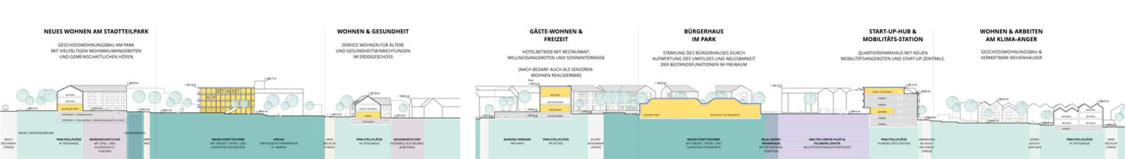 Ein Ort, an dem wir uns orientieren können ist gleichzeitig ein Ort, mit dem wir uns identifizieren – uns zu Hause fühlen! Als Ankerpunkt im Quartier wird dazu ein neuer zentraler Stadtbaustein – der Stadtteilpark vorgeschlagen. Das strukturelle Konzept sieht weiterhin die Ausbildung klar ablesbarer Teilbereiche vor, die z.T. den Walter-Lübcke-Platz baulich fassen und als Stadtplatz wahrnehmbar werden lassen. Ebenso erfolgt eine Ordnung und Betonung der Eingänge- und Zugänge ins Quartier.