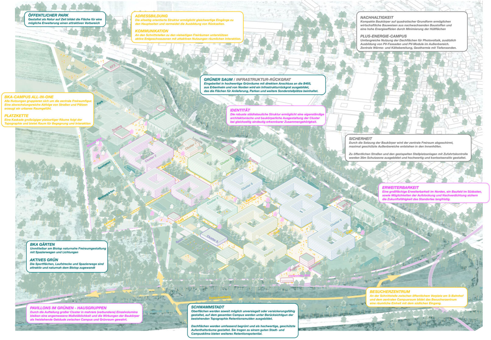 Um den zentralen Freiraum findet eine Gruppierung unterschiedlicher Funktionsbereiche in jeweils eigenständigen Gebäudegruppen statt. Diese verbinden eine städtische Maßstäblichkeit mit der Idee von in die umgebende Landschaft eingebetteten Pavillons. Sämtliche Funktionen profitieren dadurch von beiden räumlichen Qualitäten: der urbanen Campusseite mit Haupteingang und zentralen Funktionen und der Einbettung in die großzügigen und hochqualitativen Freiräume. Der zentrale Freiraum der Anlage ist ebenso ein Schutzraum – die Ausbildung hochwertig gestalteter Innenhöfe bietet Freiräume maximaler Sicherheit. Neben der Verbindung der Funktionen über den zentralen Campus ermöglichen ober- und unterirdische Verbindungen der Cluster auch witterungsgeschützte und hochsichere Verbindungen sämtlicher Funktionen.