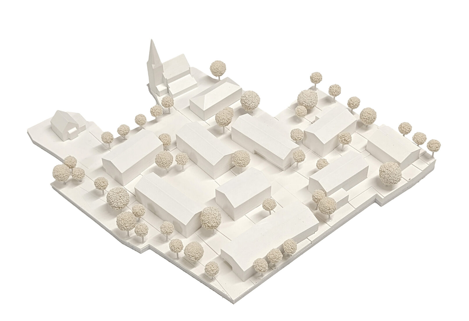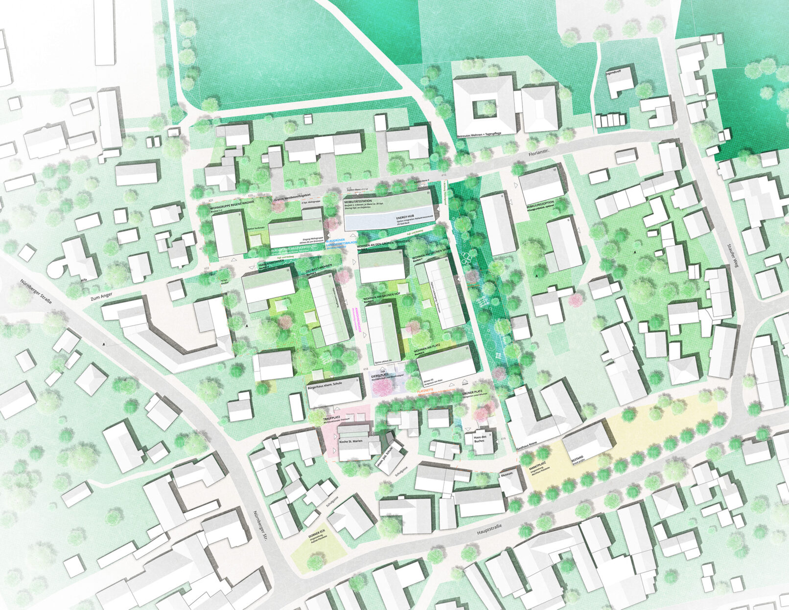 Prägend für die städtebauliche Situation im Entwurfsgebiet ist eine heterogene Bebauung aus Solitären und Nebengebäuden, die sich in Gruppen organisiert als Teilbereiche ablesen lassen sowie eine Abfolge von Plätzen, die über kleine Gassen miteinander verbunden sind. Als Antwort auf die vorhandene städtebauliche Situation schlägt der Entwurf die Ausbildung vier klar ablesbarer Bereiche als offene Blöcke vor, deren einzelne Gebäude sich in Körnung, Höhe und Dachform am Bestand orientieren und einzelne Bestandsbauten sowie die vorhandene Topografie selbstverständlich integrieren. Alle Bereiche des Gebiets sind über vielfältige Freiräume, wie die Erweiterung der Platzkette und den Blaugrünen Saum, mit dem historischen Ortskern im Süden verbunden. Der Blaugrüne Saum stellt außerdem eine neue Verbindung zum Naturraum Biotop Thalachgrund dar und verbindet hohe Gestalt- und Aufenthaltsqualität mit ökologischen und klimatischen Funktionen als neuer identitätsstiftender Naturraum. Einen besonderen Bezug nimmt der Entwurf auf die ortstypische Bebauung mit geneigten Dächern und interpretiert diese neu. Die Neubauten sind überwiegend als Geschosswohnungsbau konzipiert und können im Erdgeschoss nach Bedarf mit öffentlichen, gewerblichen oder gemeinschaftlichen Nutzungen programmiert werden. Die Gebäude stellen sich in der Regel als 3-Geschosser und je nach Topgrafie und Ausrichtung mit erhöhtem oder normalen EG dar.