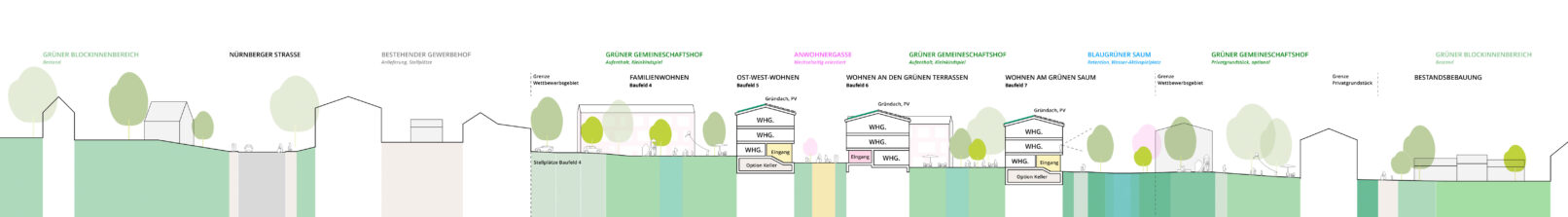 Um eine nachhaltige und zukunftsweisende Entwicklung zu gewährleisten, wird bei der Gestaltung ein besonderer Wert auf ökologische Aspekte gelegt. Die Flächenversiegelung wird auf das Nötigste reduziert, zusammenhängende Grünstrukturen werden aufgegriffen und weiterentwickelt. Der Baumbestand sowie gewachsene Heckenstrukturen bleiben erhalten und werden mit resilienten Gehölzen ergänzt. Das Regenwasser wird im Quartier entsprechend der natürlichen Topografie von West nach Ost geleitet und in ein „Blaugrünes Band“ integriert. Dieses System nutzt die abfallenden Geländestrukturen, um das Wasser über entsprechend gestaltete Mulden- und Pflanzbereiche entlang des „Wasserwegs“ in das Blaugrüne Band zu führen, wo es langsam versickern und verdunsten kann. Durch diesen Ansatz wird das Mikroklima des Quartiers spürbar verbessert, da die Verdunstung an heißen Tagen zur Abkühlung der Umgebung beiträgt und die Luftfeuchtigkeit erhöht. Das Blaugrüne Band dient nicht nur als ökologisches und klimapositives Element, sondern auch als attraktiver, identitätsstiftender Bestandteil des Quartiers, der Aufenthaltsqualität und Biodiversität erhöht.